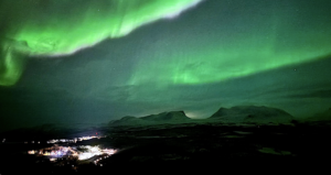 Gröna stråk började röra sig över himlen och norrskenet bredde ut sig och böljade fram över fjällen medan liftkorgarna sakta gled ner mot dalen. Det blev ganska tyst i liften. Otroligt magisk och mäktig upplevelse. Nästan overkligt.